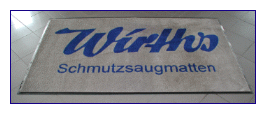 | Von uns werden ausschließlich europäische Spitzenprodukte von namhaften Herstellern verwendet. In einem ausführlichen Beratungsgespräch mit dem Kunden verlegen wir je nach Anforderung Baumwoll oder High-Twistet Nylon Matten mit oder ohne umlaufenden Gummirand. Alle Schmutzsaugmatten sind mit einer rutschfesten Gummirückseite versehen. Rollwagen und ähnliche Transportgeräte fahren mühelos darüber hinweg.